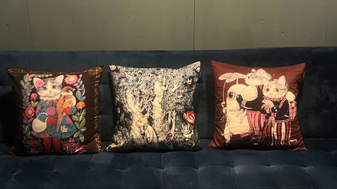 - グリーンのソファベッドに、とてもはえています(^-^)生地はチョツト固めでしたが刺繍とても豪華でステキです。